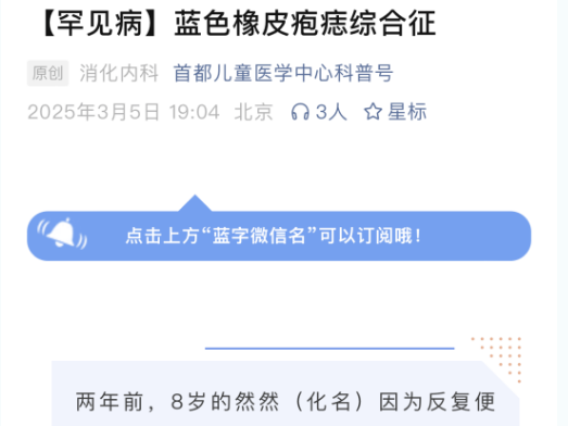 2025年首都儿童医学中心科普文章top10 1、蓝色橡皮疱痣综合征 2、儿童结肠癌 3、宝宝洗屁屁有讲究:肾内科医生指导您1分钟把好“防感染·护肾脏”第一关 4、黏多糖贮积症 5、家族性高胆固醇血症 6、Alport综合征...